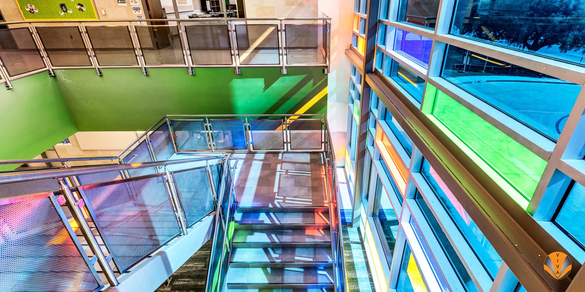 The colored glass panels create a playful colorscape on the CIRCA® Perf Railing System and, combined with bright paint colors, creates a space that encourages excitement and creativity.