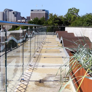 A glass railing is a modern balcony railing option that allows for nearly unobstructed views of the surrounding areas while meeting building code standards. The infill is made from either tempered or laminated glass and can be tinted, frosted, or patterned to meet your design needs. These sturdy systems come with a range of post options and are ideal for both interior and exterior applications where maintaining the view is important to the success of the design.