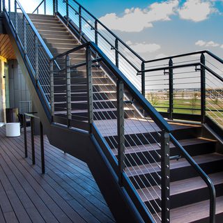 The railings system installed at Dick’s Sporting Goods in Minnetonka, Minnesota is the perfect complement to the overall design. The light wood railing blends seamlessly with the wood floors and the black powder coated posts add a modern spin enhanced by the streamlined multiline infill. The BLADETM Multiline Railing System pulls everything together to create a cohesive look that offers safety and code compliance.