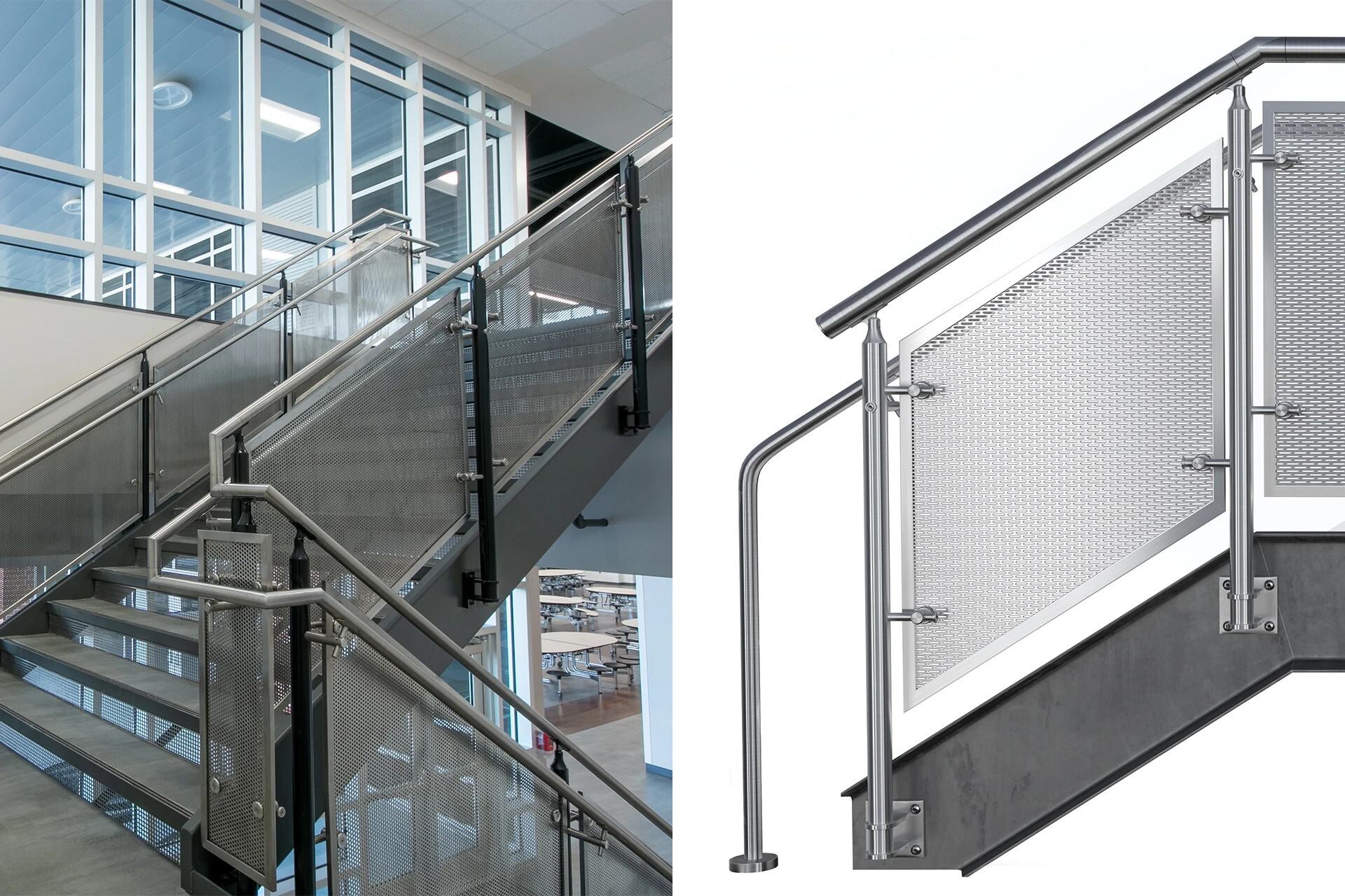 Perforated metal railing systems include: