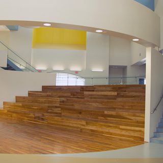Lee Elementary also features the Learning Stair along with our VISIO™ Glass Line. Similar to the K-8 Stem Academy, it’s a small wooden bench like structure, blended in with the open library area near the entrance of the school and a small free standing rail on the right.